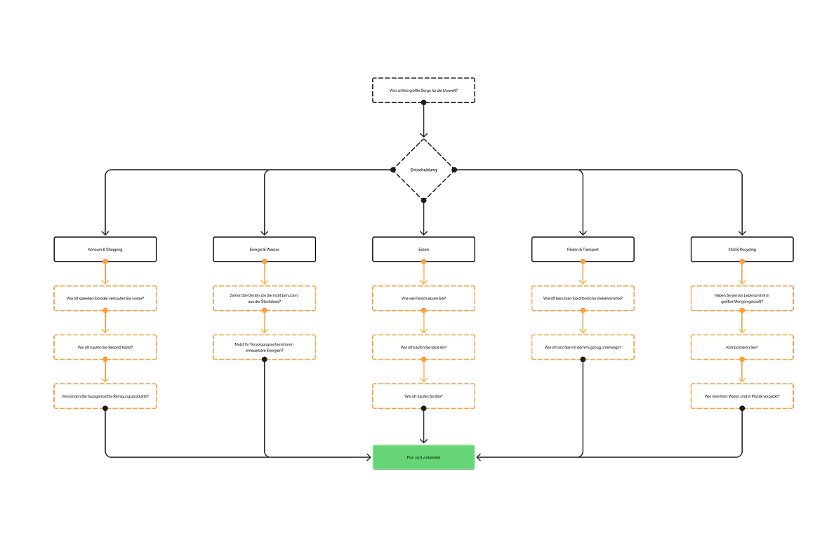 Für dieses Projekt habe ich den Fokus in der Konzeption bewusst auf einen klar strukturierten User Flow gelegt. Ziel war es, das Onboarding so intuitiv und niederschwellig wie möglich zu gestalten – ohne dabei auf inhaltliche Tiefe zu verzichten. In mehreren Testing-Phasen wurden die Fragestellungen iterativ weiterentwickelt, um ein optimales Gleichgewicht zwischen Nutzerfreundlichkeit und Informationsgewinn zu schaffen.